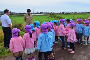 前日の雨の影響でコンバインでの収穫作業は見学できませんでしたが、広い田んぼを囲み、稲穂に触れたり、担当した職員に質問するなど元気いっぱい学んでいました。